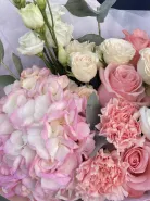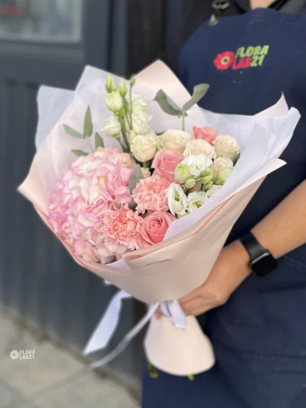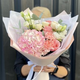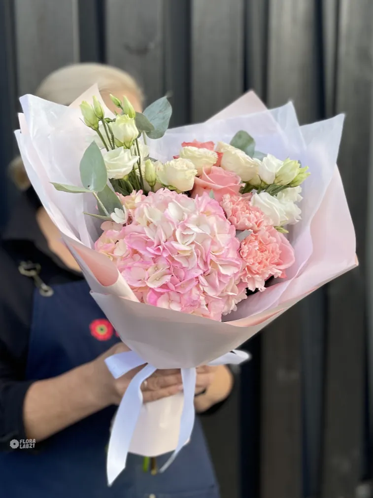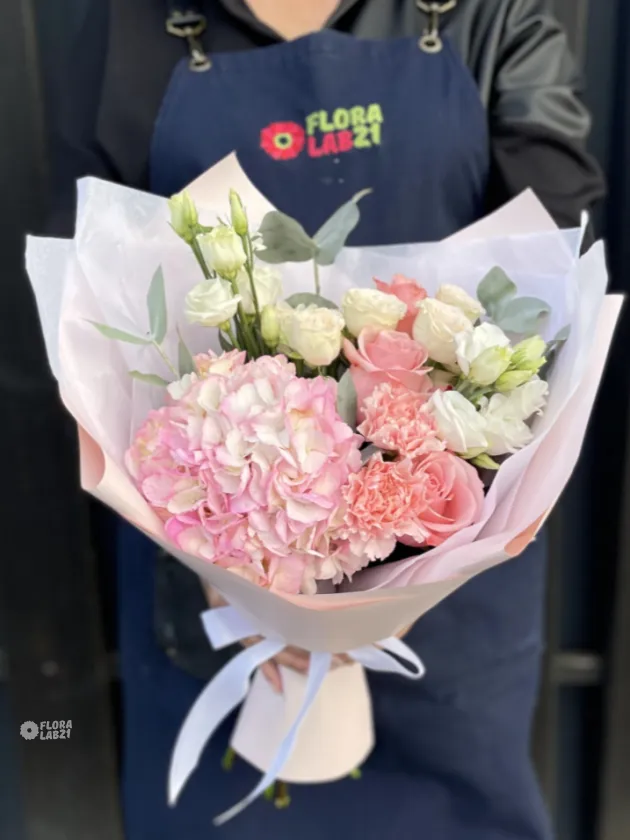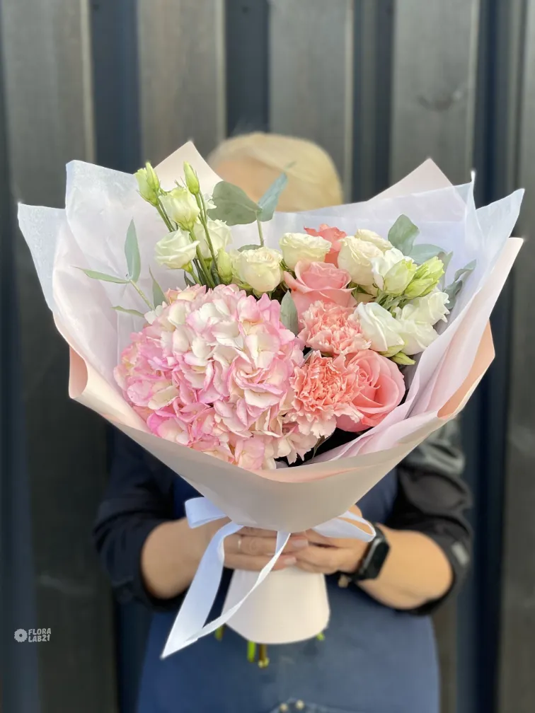 В основе букета гортензия, которая изящно переплетается с классическими одноголовыми и кустовыми розами, создавая объемную и многослойную композицию Диантусы добавляют букету графичности и элегантности, а нежные эустомы привносят в него особое очарование и воздушность.