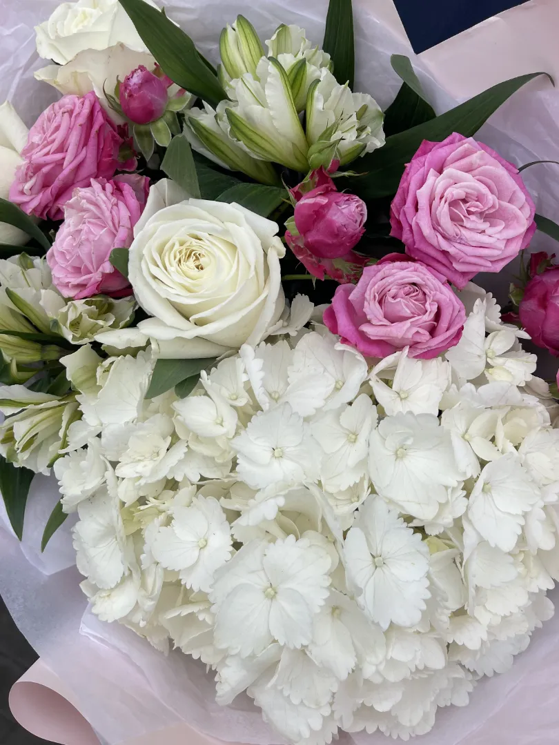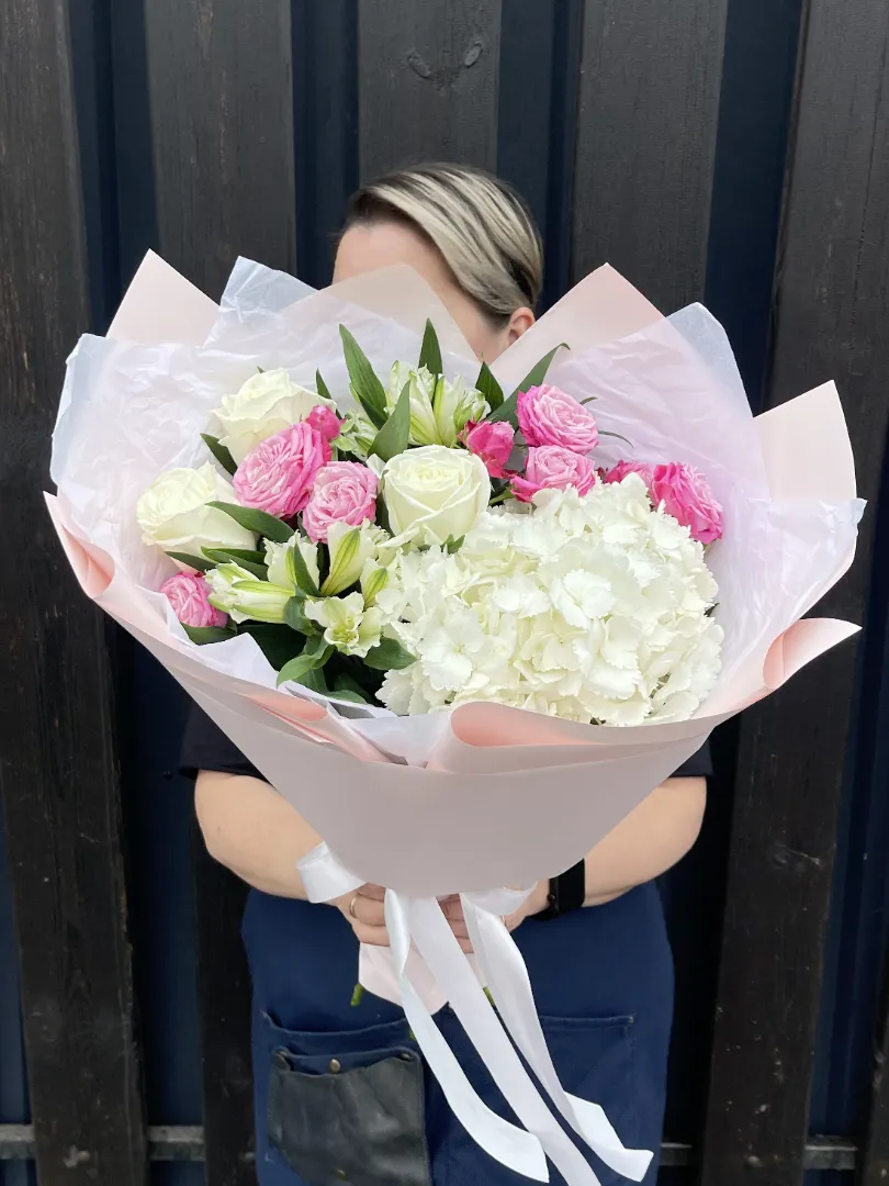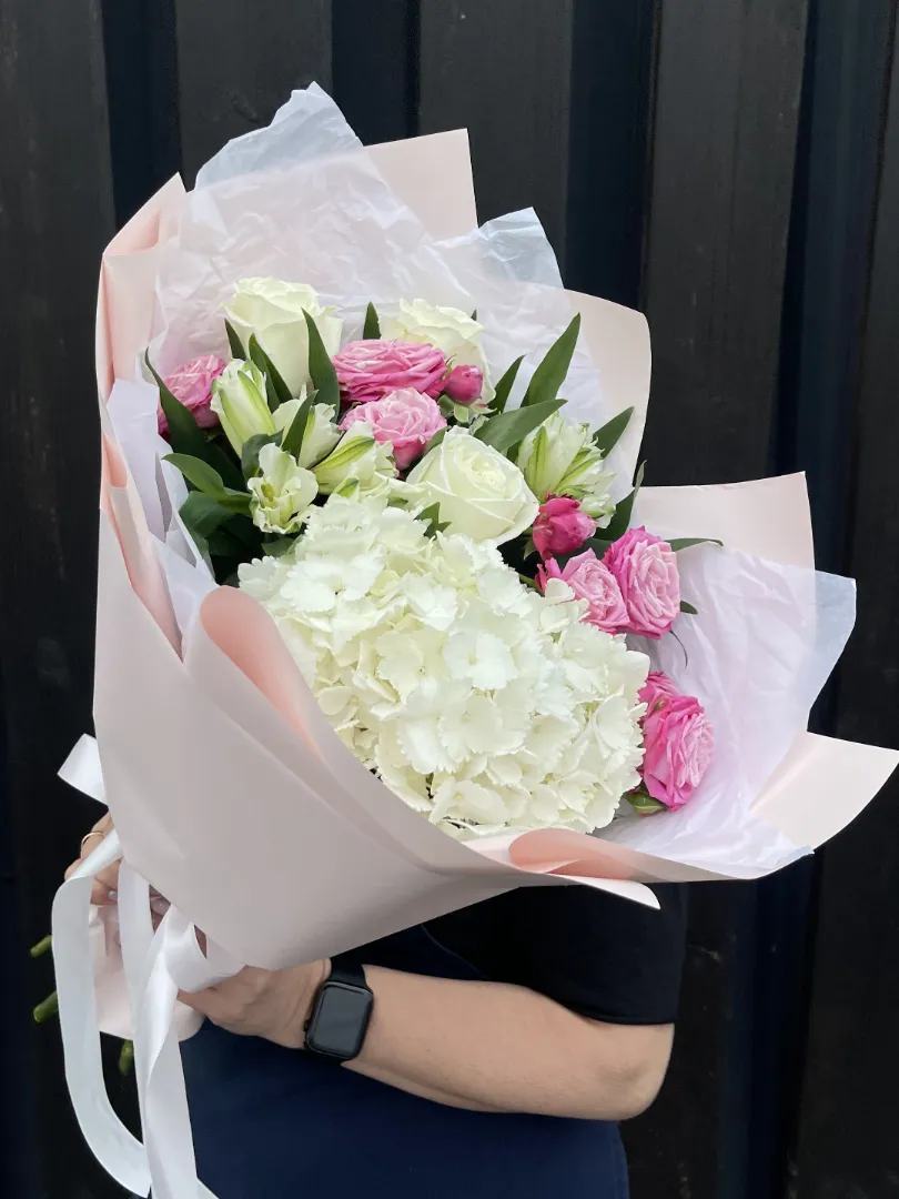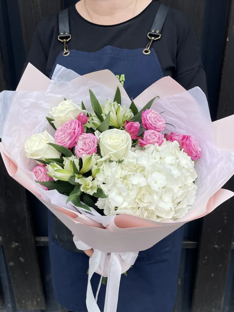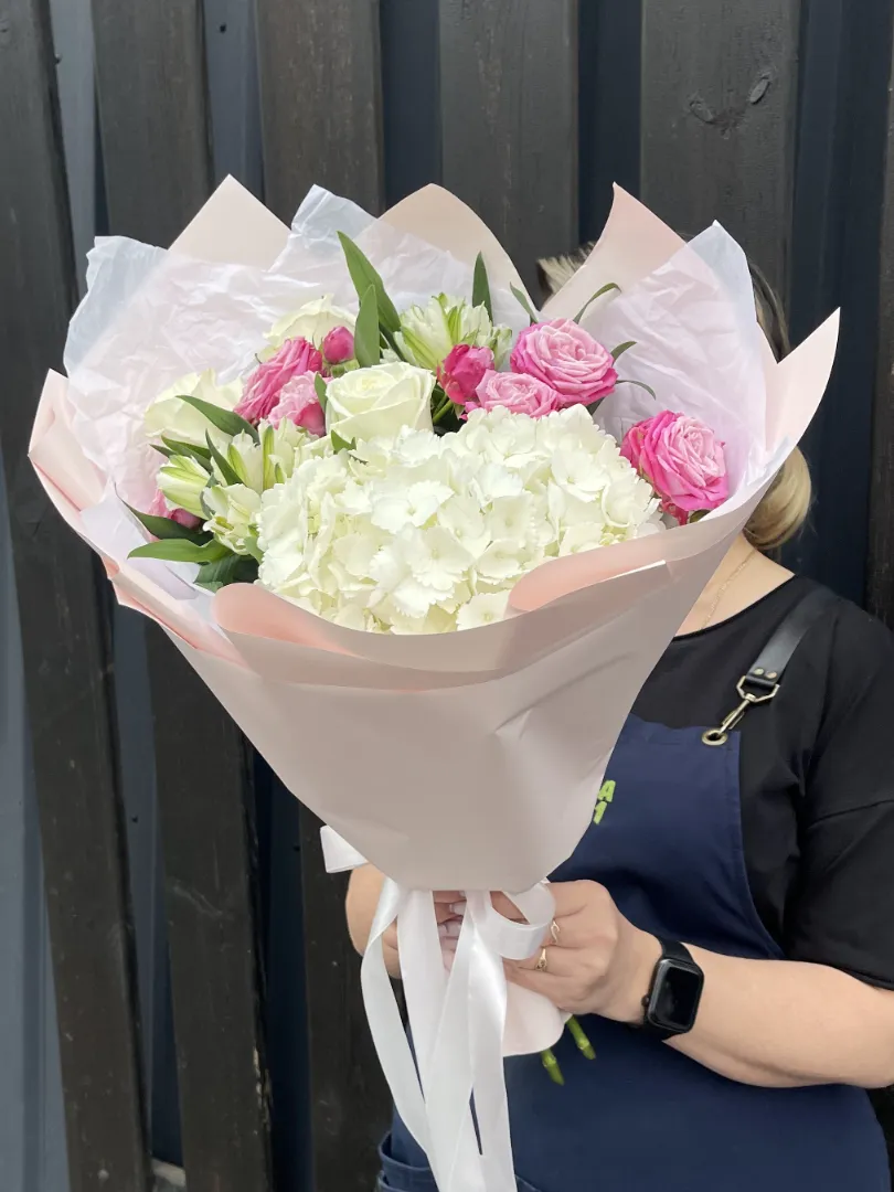 Легкий воздушный букет комплимент с пионовидными розами двух сортов, пышной гортензией и альстромериями. Уместный комплимент для уютного ужина, вечернего свидания или просто как повод порадовать любимого человека.