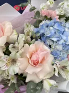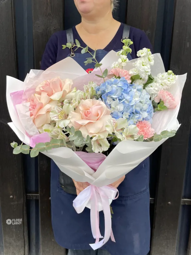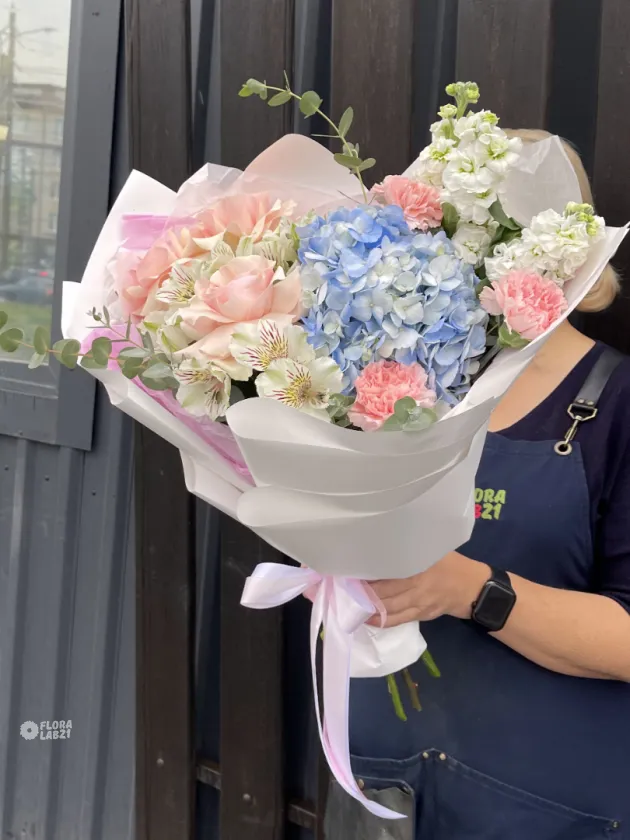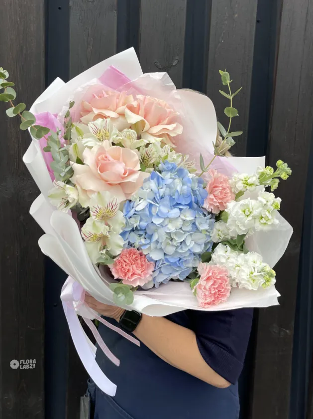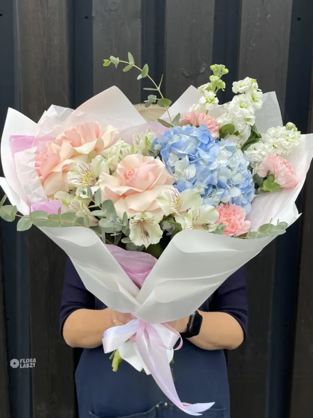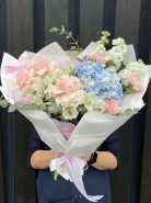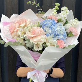 Воздушный, лёгкий букет «Мелодичные переливы» — словно музыкальное произведение, воплощённое в цветах. Нежные оттенки лета сплетаются в гармоничную композицию, дарящую ощущение свежести и радости