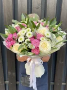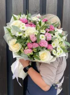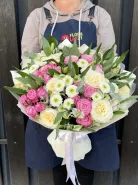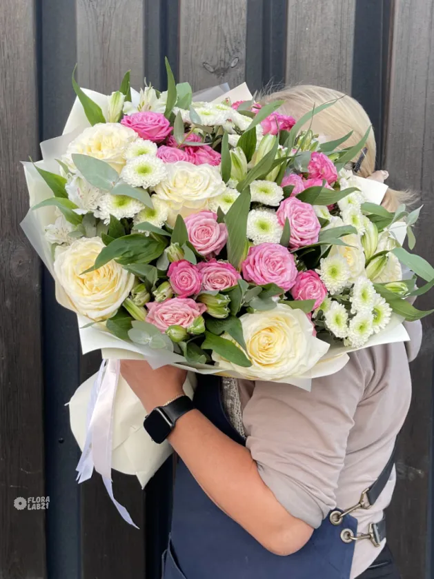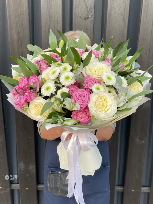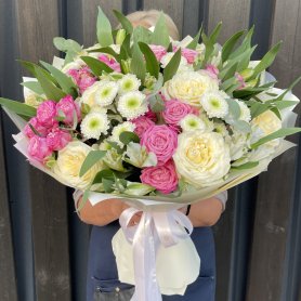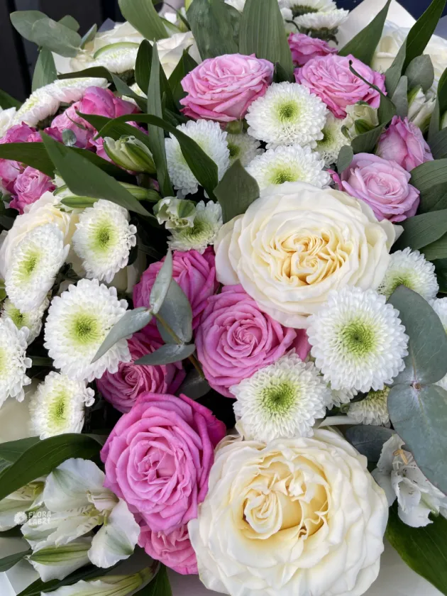 Сочетание одноголовых кремовых пионовидных роз сорта Кэндллайт (Candlelight) и кустовых розовых роз сорта кустовых Леди Бомбастик (Lady Bombastic). В букете также представлены кустовые хризантемы Дэйдрим (Daydream) и стойкие альстромерии. Оформление с веточками сочного эвкалипта.