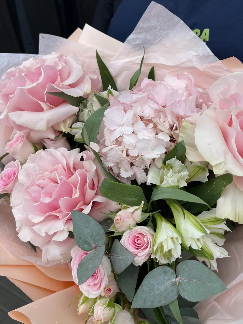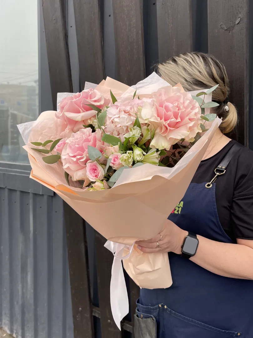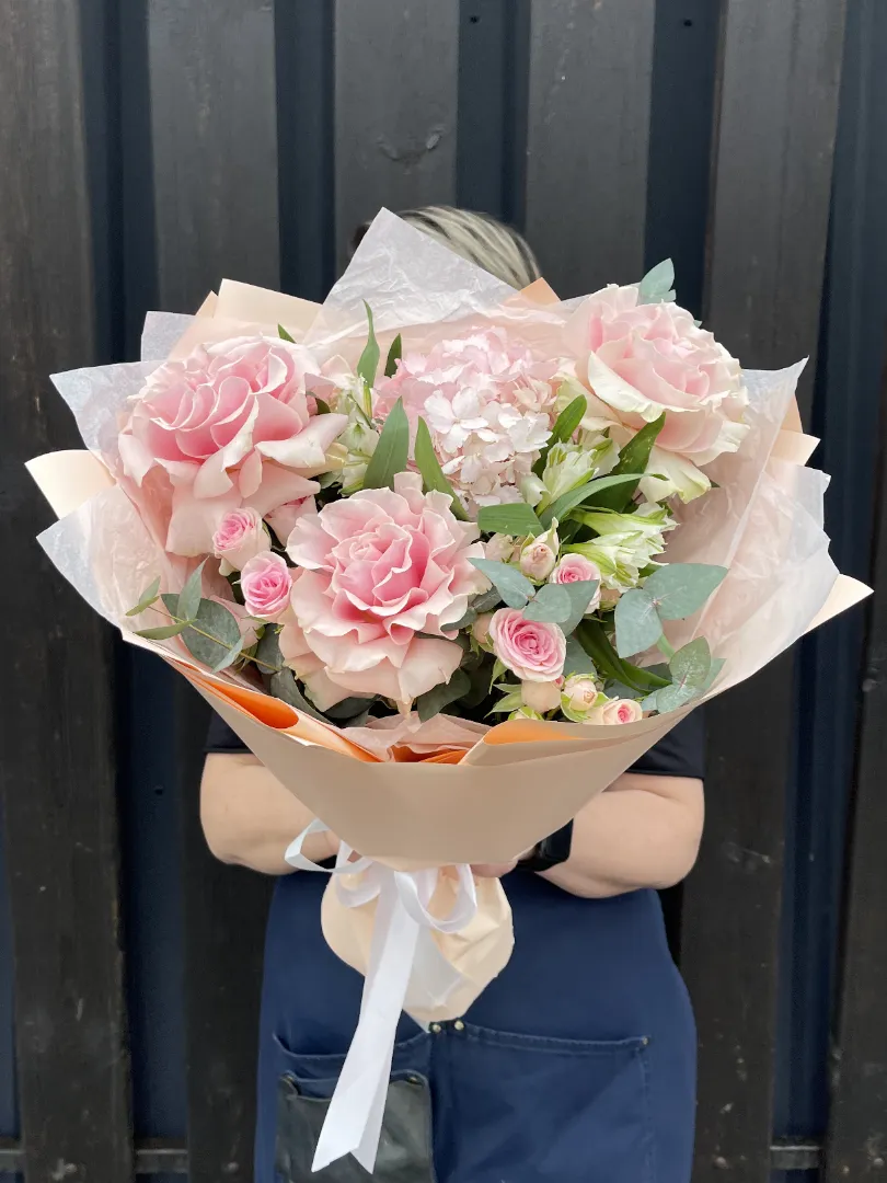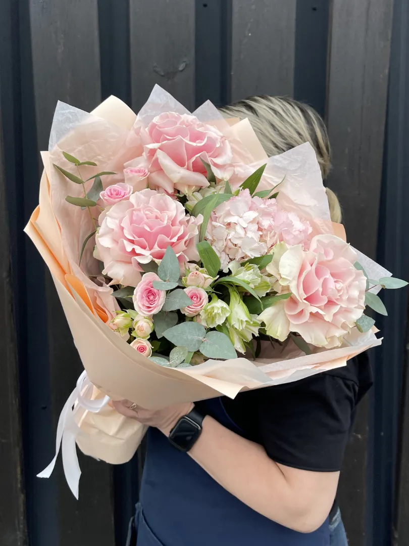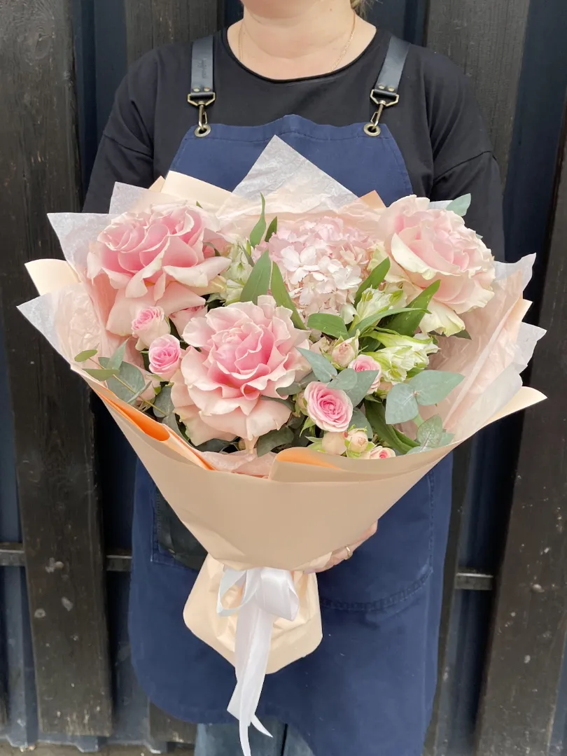 Французские розы придают букету изысканность и элегантность, гортензия — пышность и объём, а альстромерии и кустовые розы — свежесть и лёгкость.