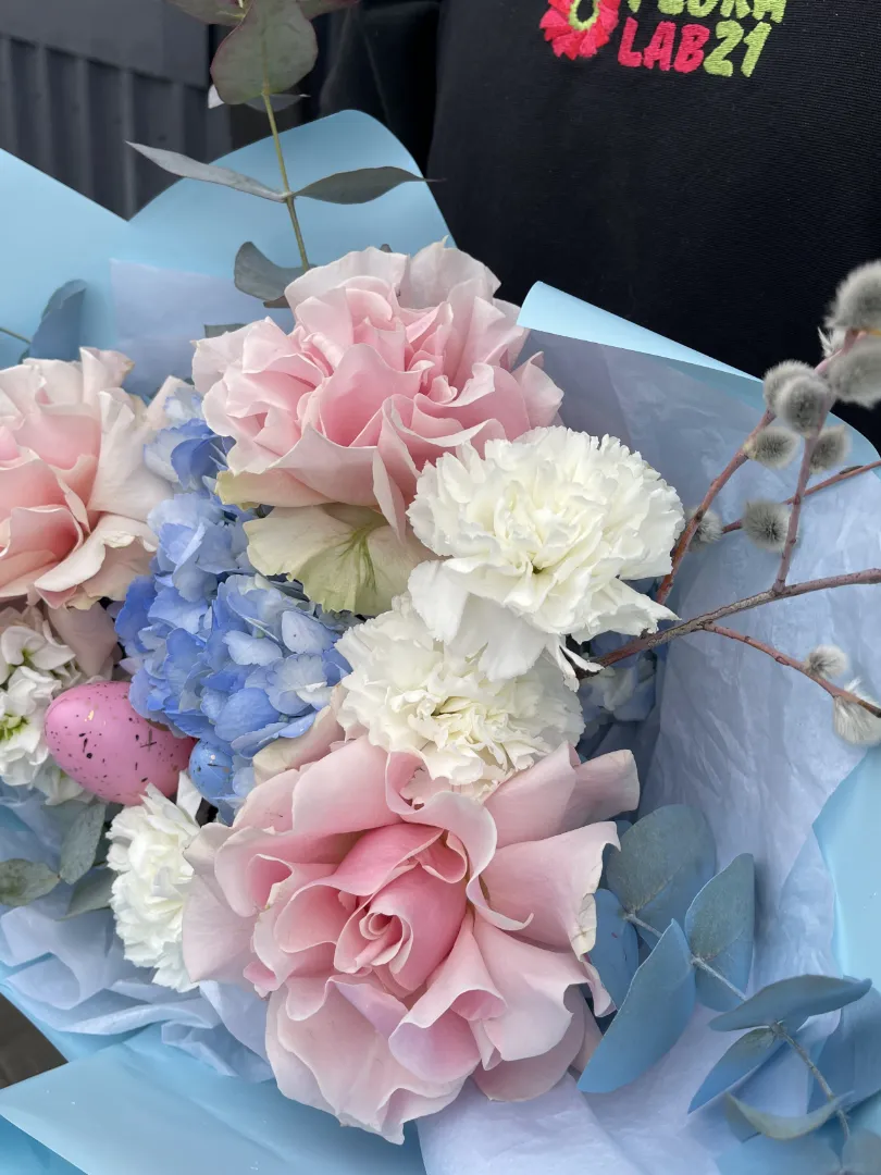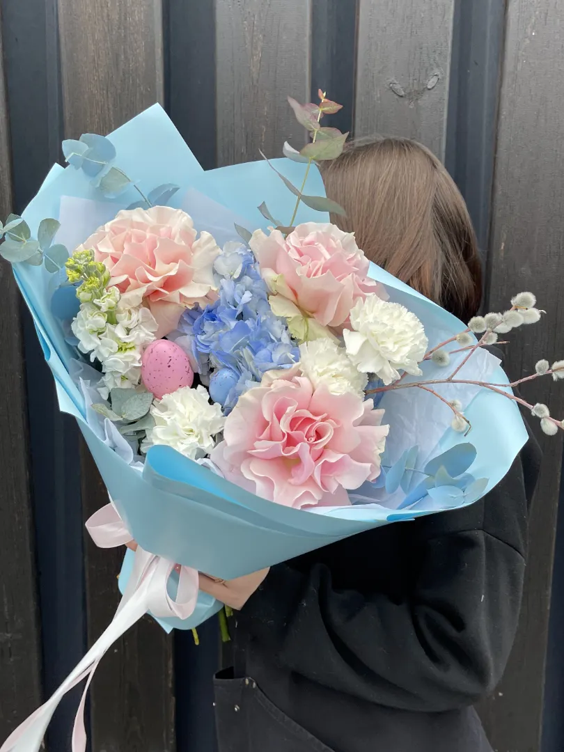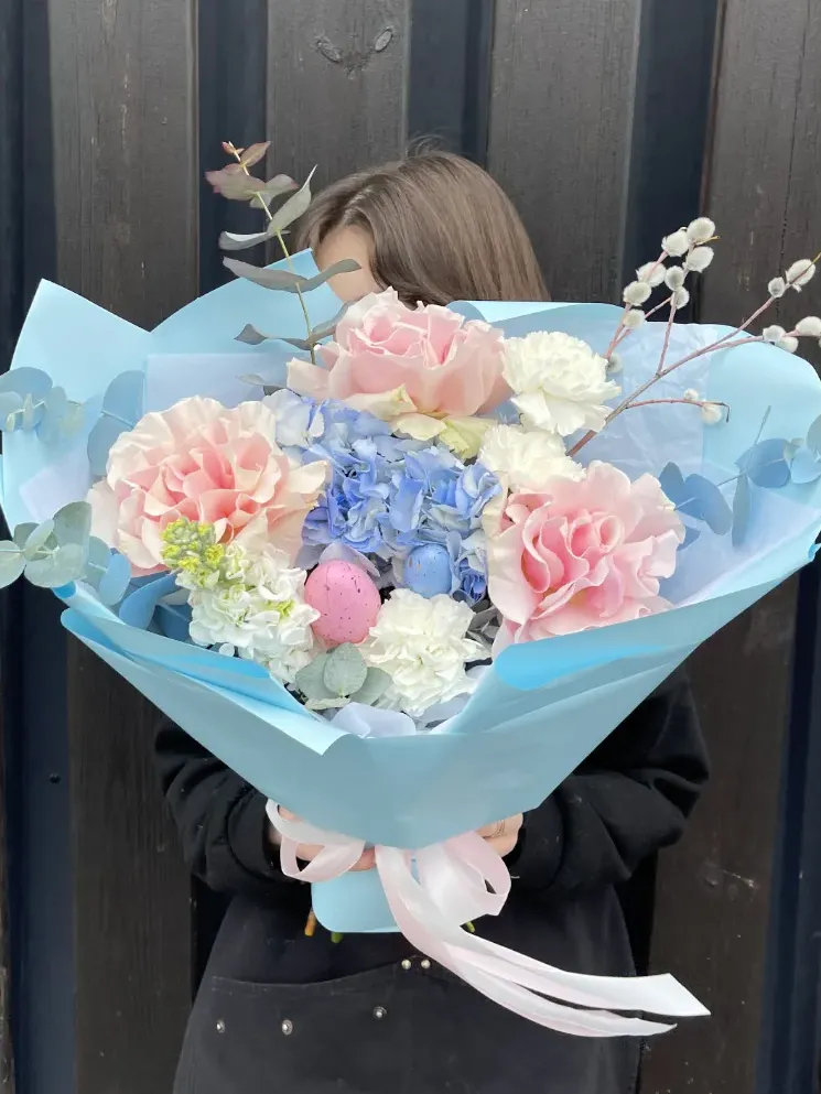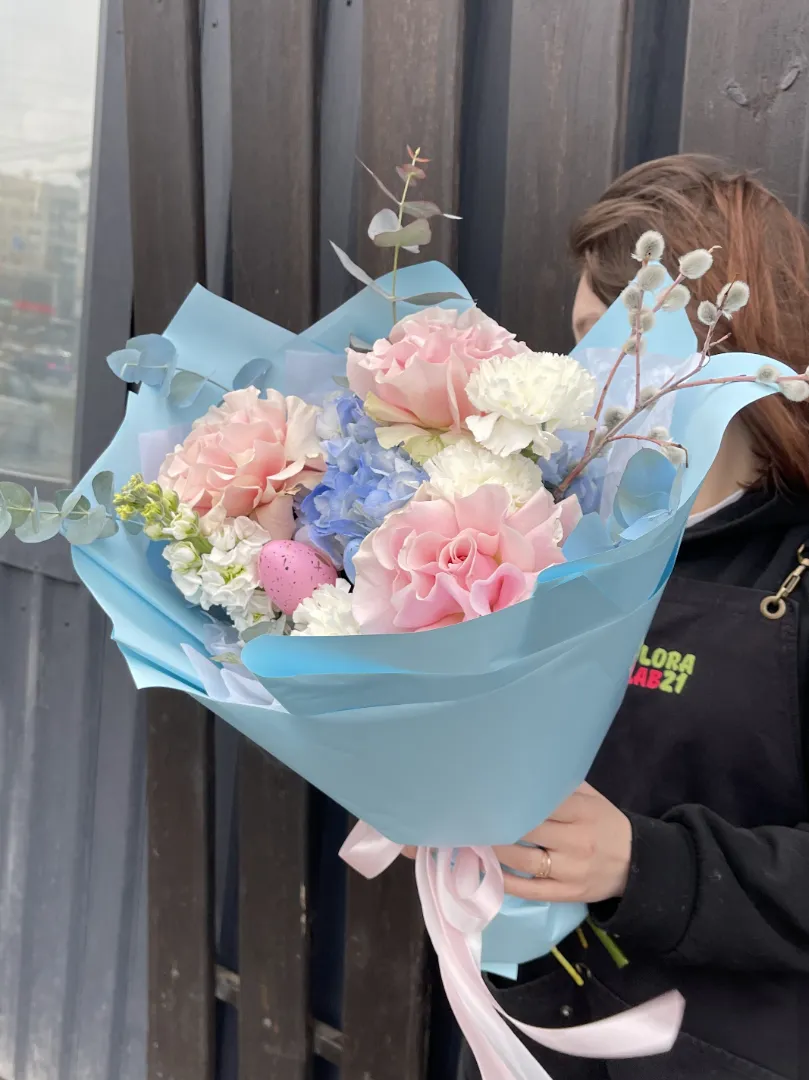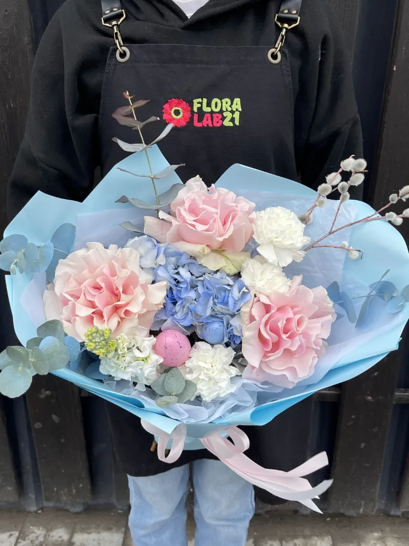 Лёгкий воздушный букет для светлого христианского праздника. Включает в себя нежную гортензию, пышные французские розы и другие изысканные цветы. В букете присутствуют элементы пасхального декора: маленькие яркие яйца и веточки зелени вербы. Всё это создаёт атмосферу Пасхи, наполняя пространство добрым весенним настроением.