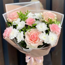 Всем любителям мимимишности посвящается) Презент для молодой девушки, подруги, дочери, маме, бабушке и всем любимым и дорогим. Сборный аккуратный букет в нежных тонах с французскими розами, кустовыми хризантемами и диантусами. Оформление с декоративной зеленью в стильной дизайнерской упаковке.