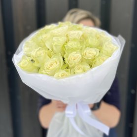 Небольшой букет из 25 белых роз — символ чистоты и нежности. Подойдёт для выражения самых светлых и искренних чувств, станет уместным подарком на день рождения, для свидания или просто порадовать близкого человека. гармонии и умиротворения. Страна Кения. Высота стебля 40 см. Оформление в дизайнерской бумаге.