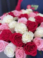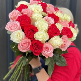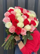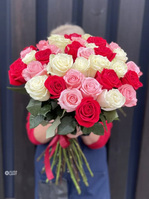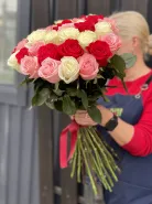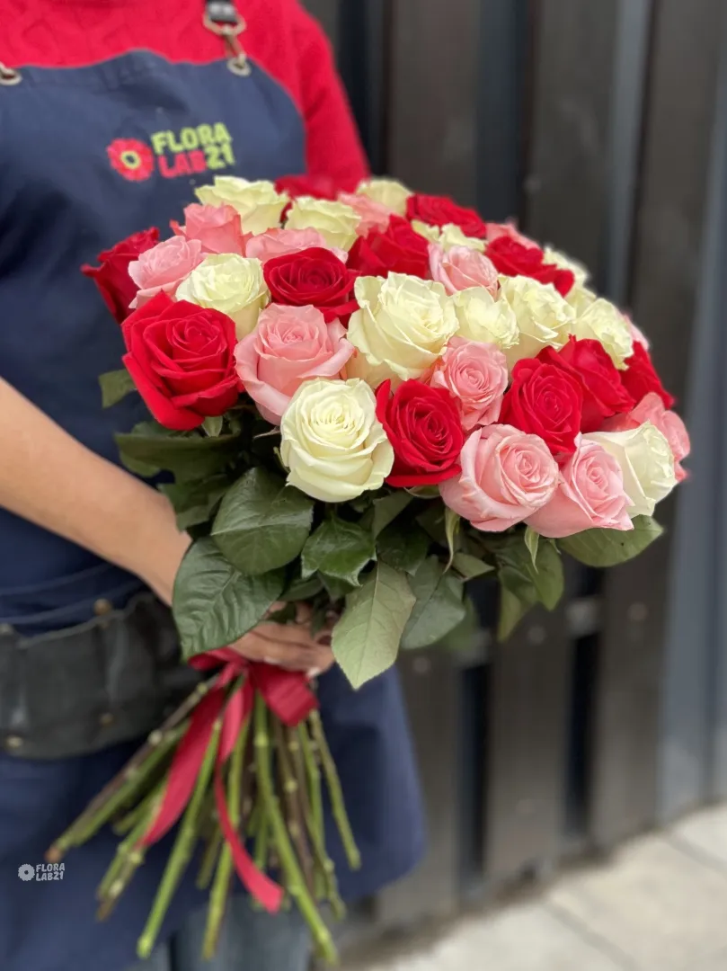 В букете встретились три сорта классических роз: насыщенные красные Фридом, нежные белые Мондиаль и утончённые розово-кремовые Би Свит. Такое сочетание создаёт атмосферу радости, тепла и праздника, делая этот букет идеальным выбором для романтической встречи, яркого поздравления или выражения самых искренних чувств. Он станет незабываемым подарком, который подарит улыбку и радость любимой девушке, дорогой маме или близкому коллеге.