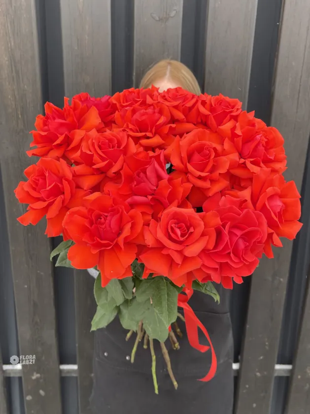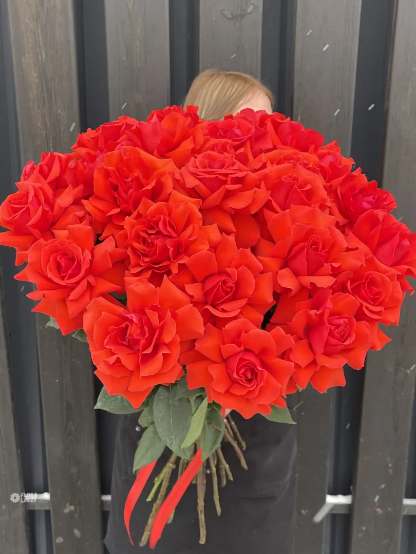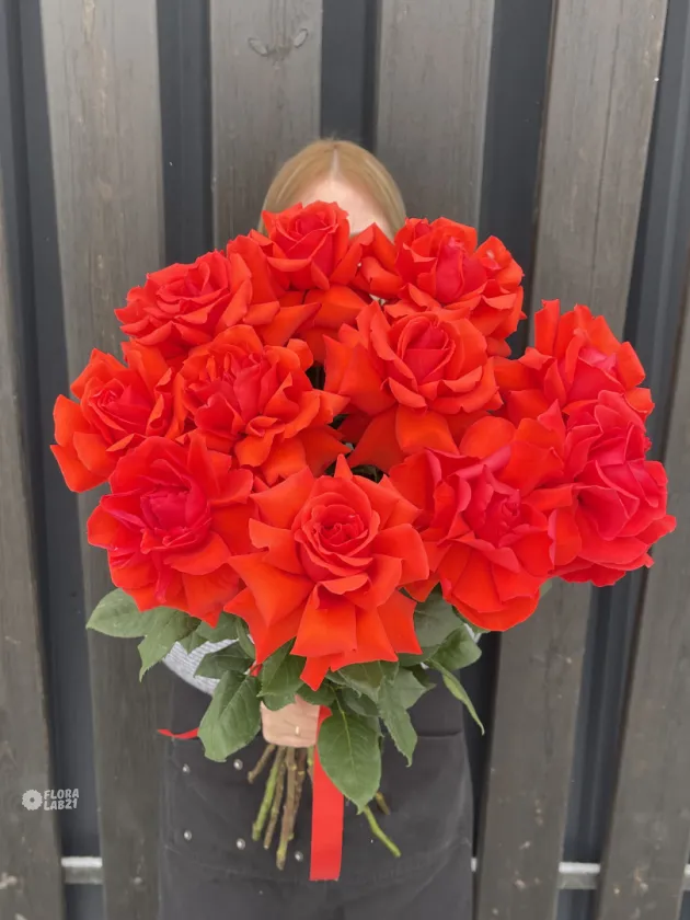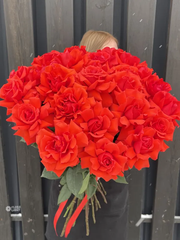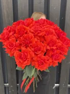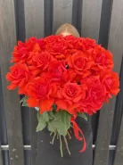 Моно исполнение из пышных французских роз насыщенного алого цвета. Эти цветы, без лишних атрибутов, эффектно и искренне передадут глубину ваших чувств.