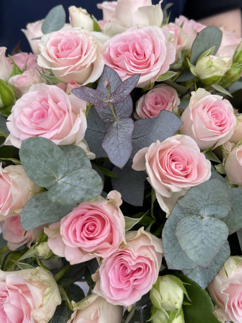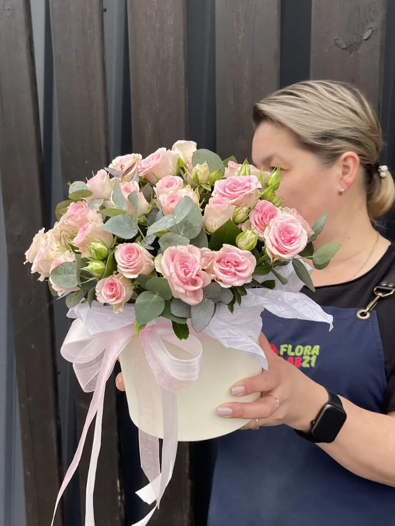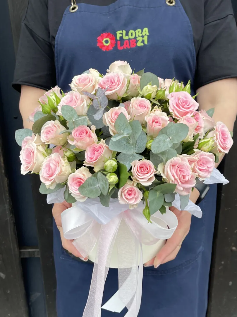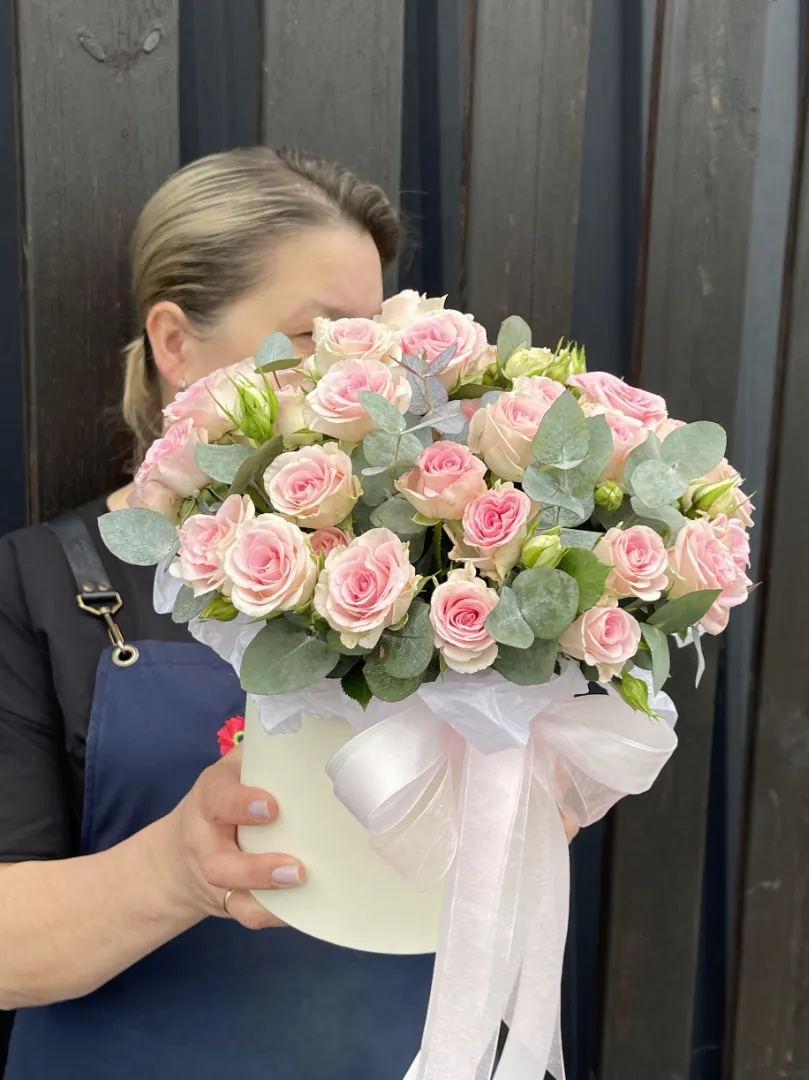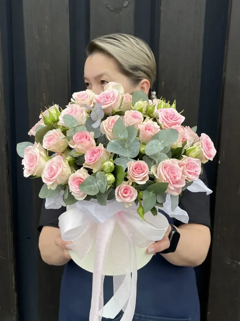 Композиция «Я с тобой летаю» в молочной шляпной коробке символизирует свежесть, лёгкость, воздушность и гармонию. Бело-розовые кустовые розы с веточками эвкалипта создадут любимому человеку атмосферу уюта и спокойствия, вызовут ассоциации с пляжем и морским бризом.