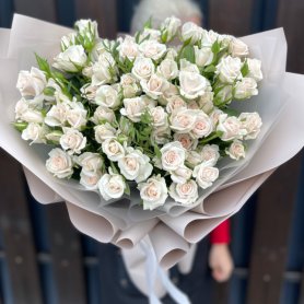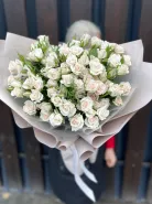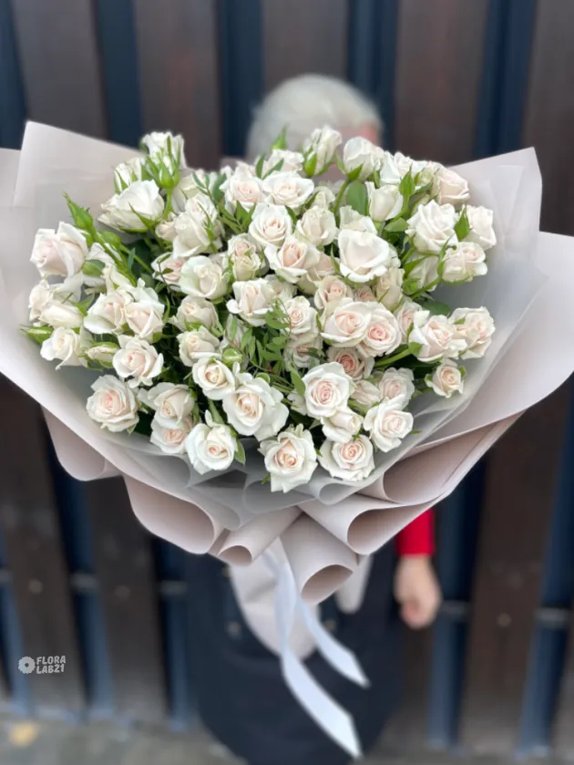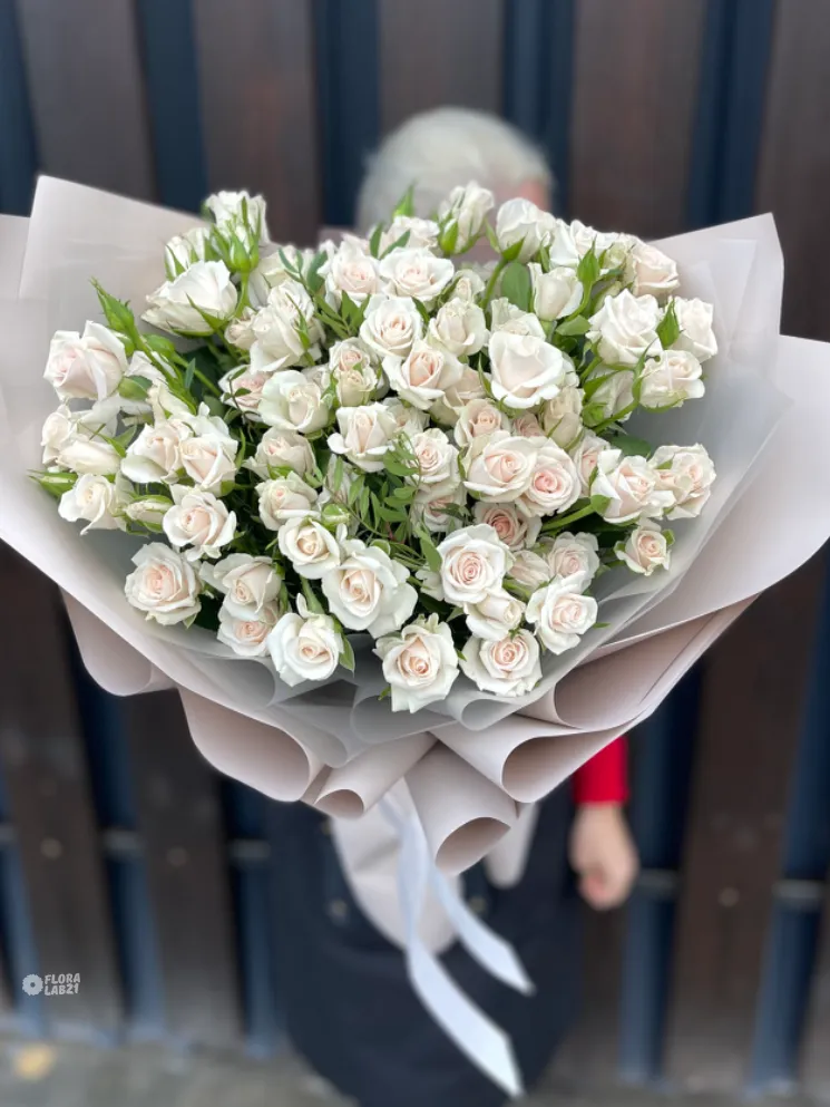 Монобукет из кустовых роз бело-кремового цвета. К доставке доступны от 9 роз и более. Количество можно как выбрать из вариантов, так и согласовать индивидуально. На фото представлен букет из 15 кустовых веток. Оформление в дизайнерской упаковке.