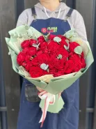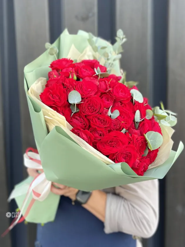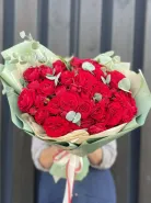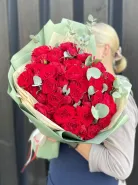 Оформление с веточками свежей зелени, в дизайнерской бумаге. Возможно собрать как предложенные варианты, так и индивидуальное количество. На фото представлен букет из 15-ти кустовых стеблей.