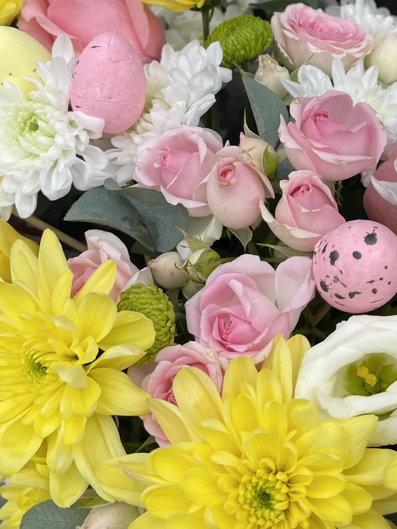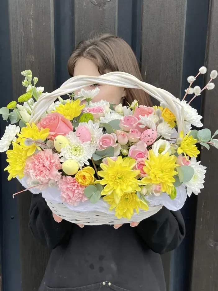 «Христово воскресение» - пасхальная композиция в корзине с веточками вербы, весенними нарциссами, ансамблем цветов белого и розового тона и декоративными яйцами. Станет прекрасным украшением вашего дома на Пасху и подарит атмосферу праздника.