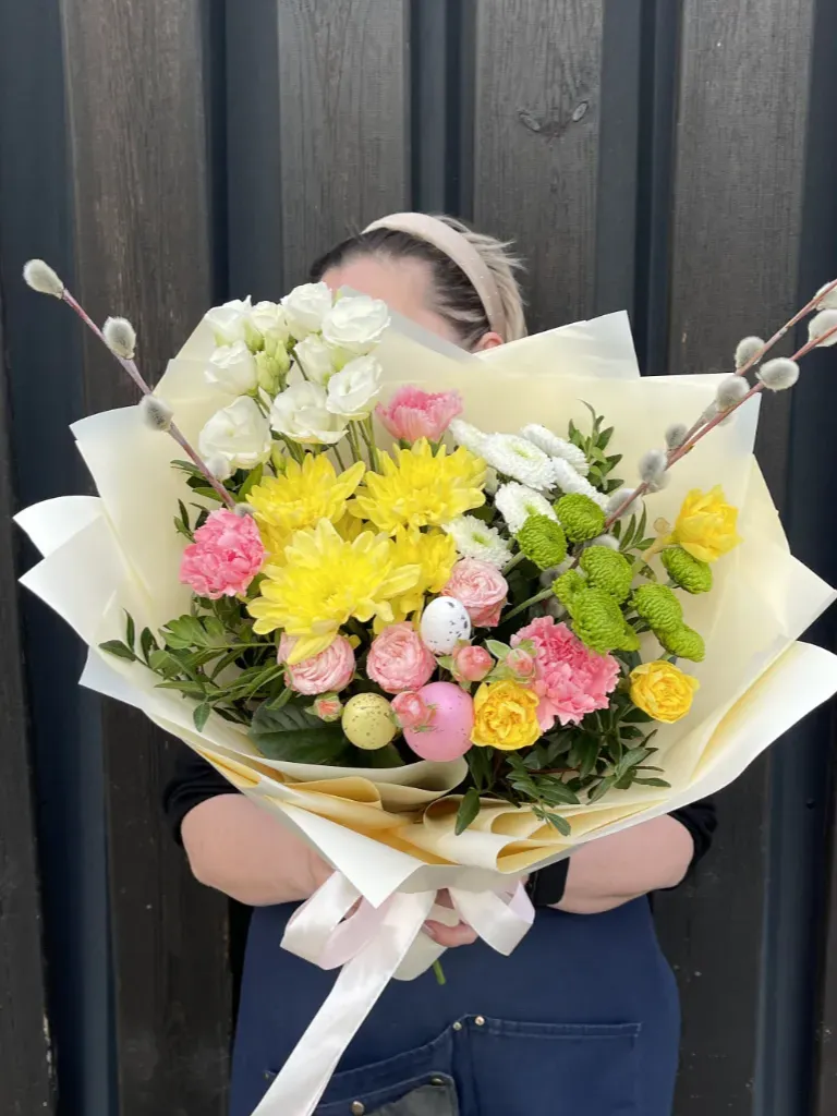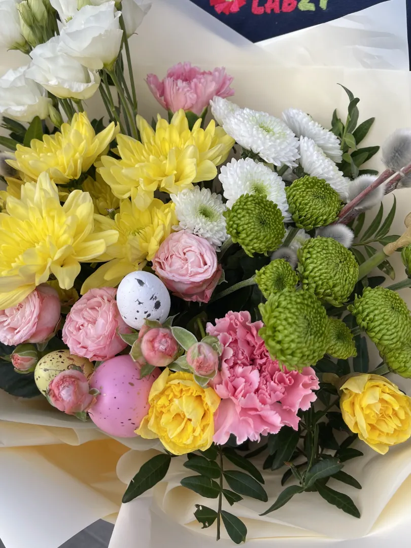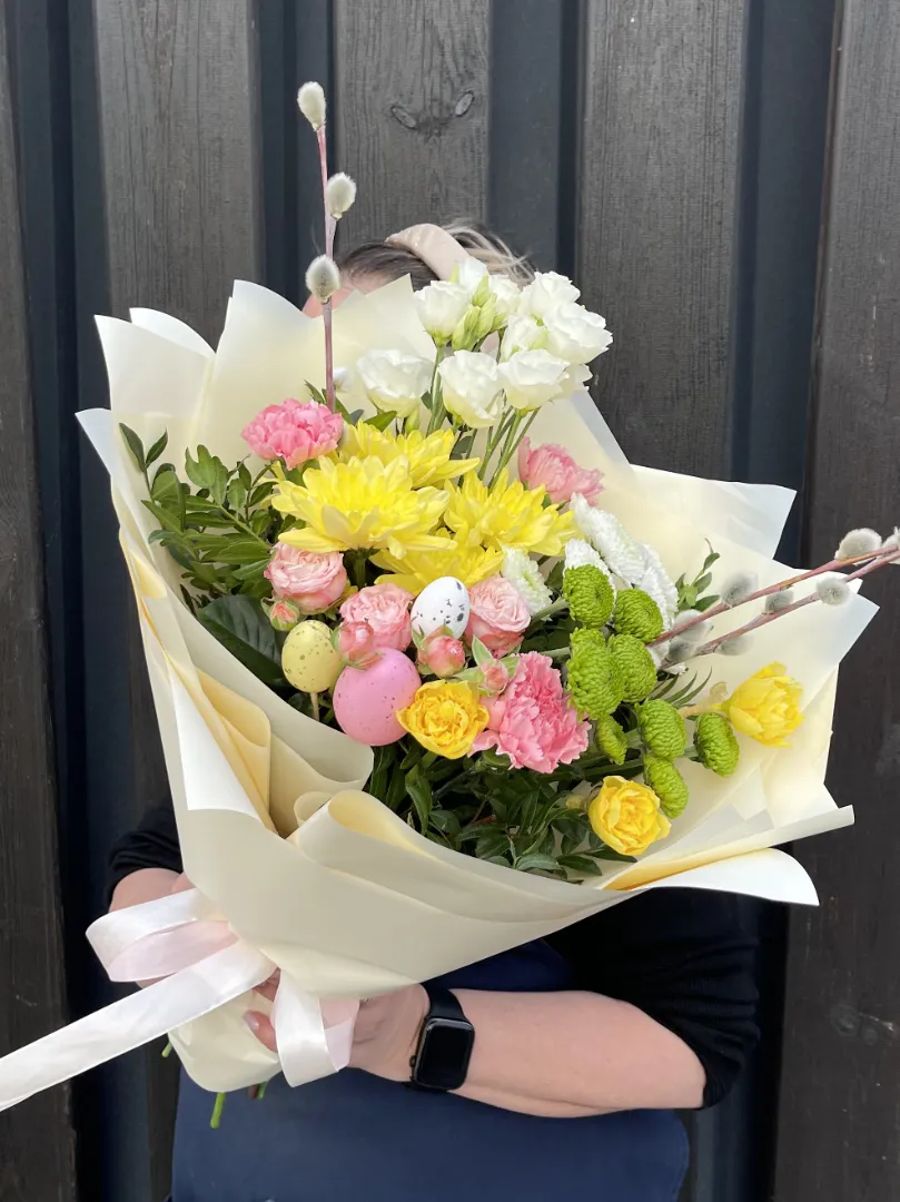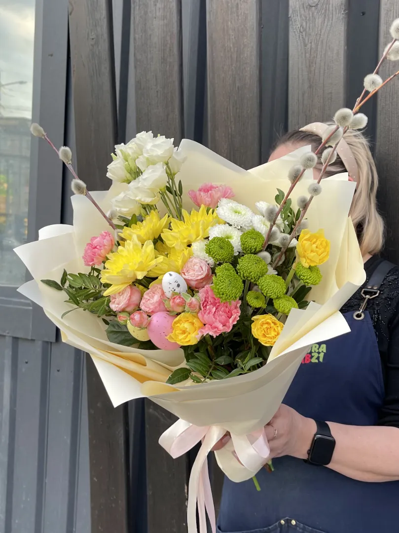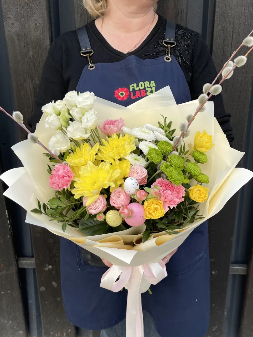 Букет подойдет в качестве подарка на Пасху.или дополнением к праздничному столу.